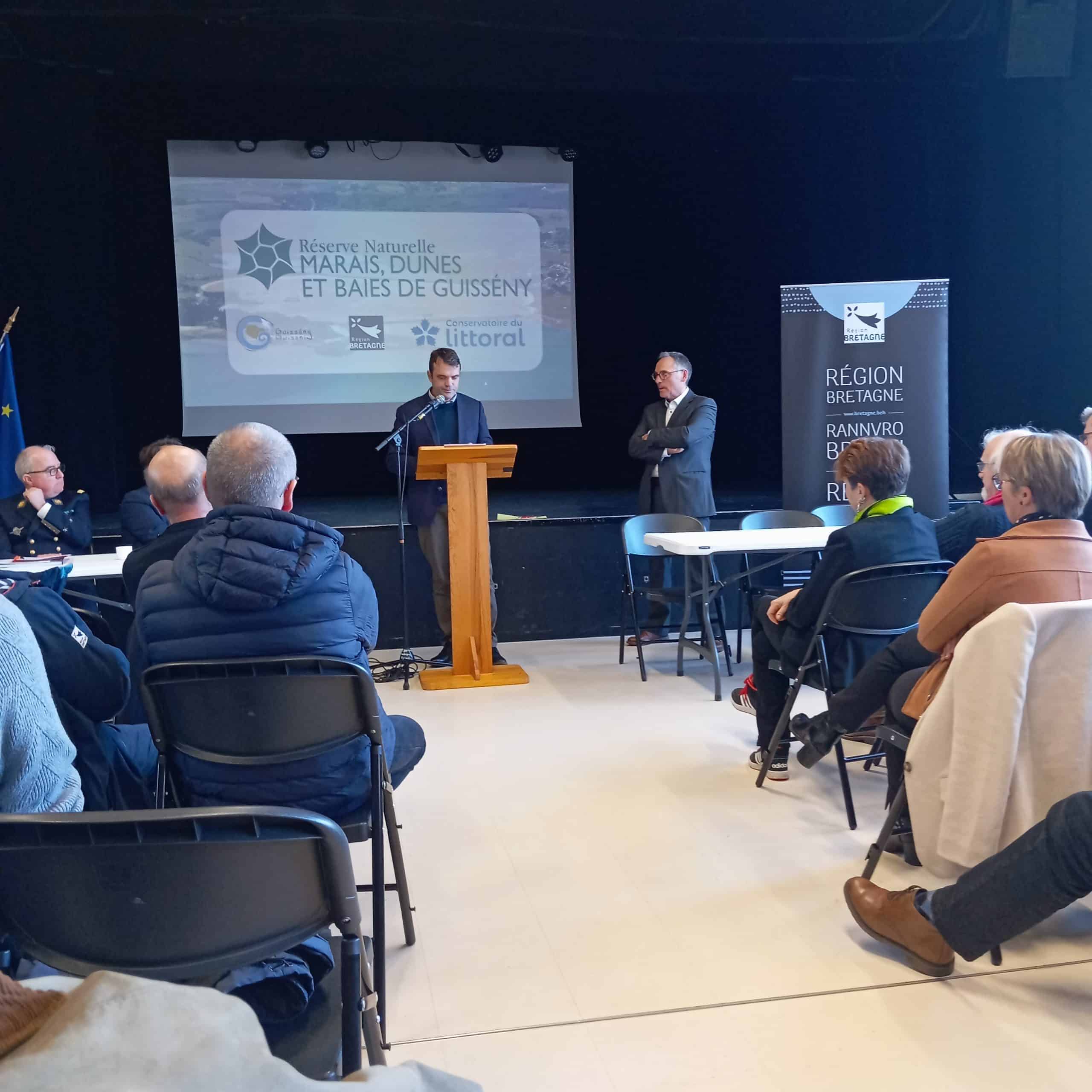 La cérémonie a été marquée par plusieurs prises de parole : le maire de Guissény, le président de la Région Bretagne, Michel Delmas, président de Réserves naturelles de France, Michel Peltier du Conservatoire du littoral, ainsi que l’adjoint du préfet maritime. De nombreux professionnels travaillant dans les espaces protégés étaient également présents, dont Manu, témoignant de l’intérêt collectif pour cette nouvelle RNR.
