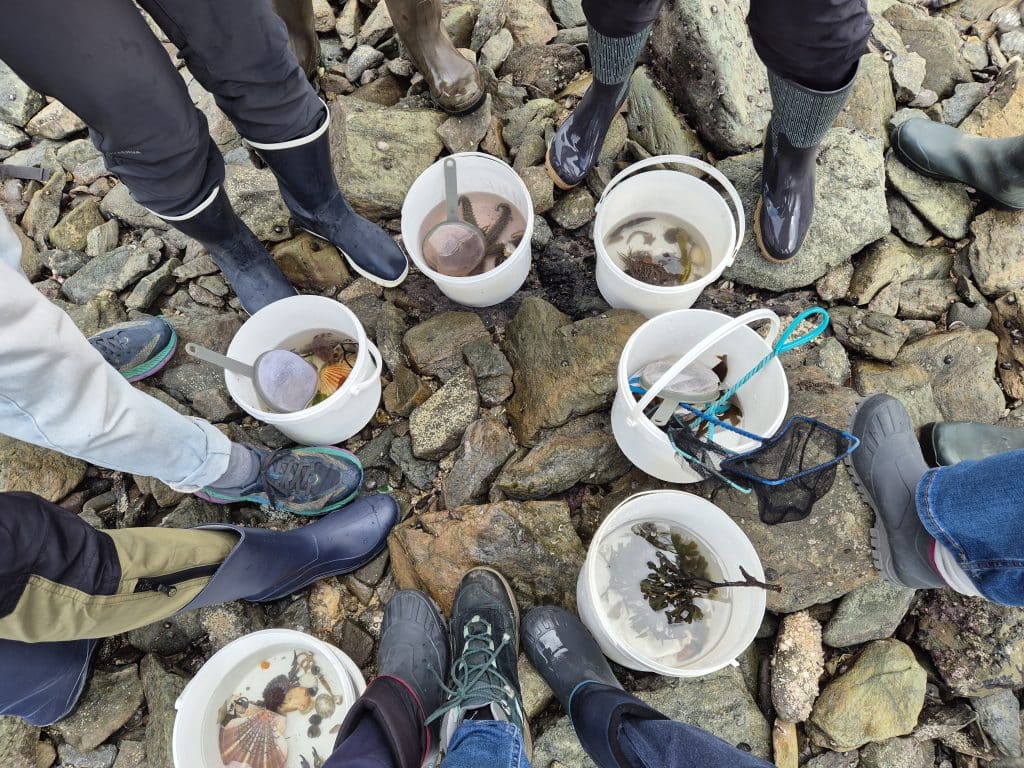 Le stage s’est terminé avec une belle marée de coefficient 96, l’occasion idéale d’aller explorer l’estran rocheux du Dellec et de mettre en pratique les connaissances fraîchement acquises. Les participants ont pu tenter de reconnaître notamment à l’aide de l’application Bernic & clic, les différentes espèces d’algues – des algues brunes comme le varech aux algues vertes en passant par les algues rouges et calcaires – et les nombreux animaux présents dans les flaques et sous les blocs.