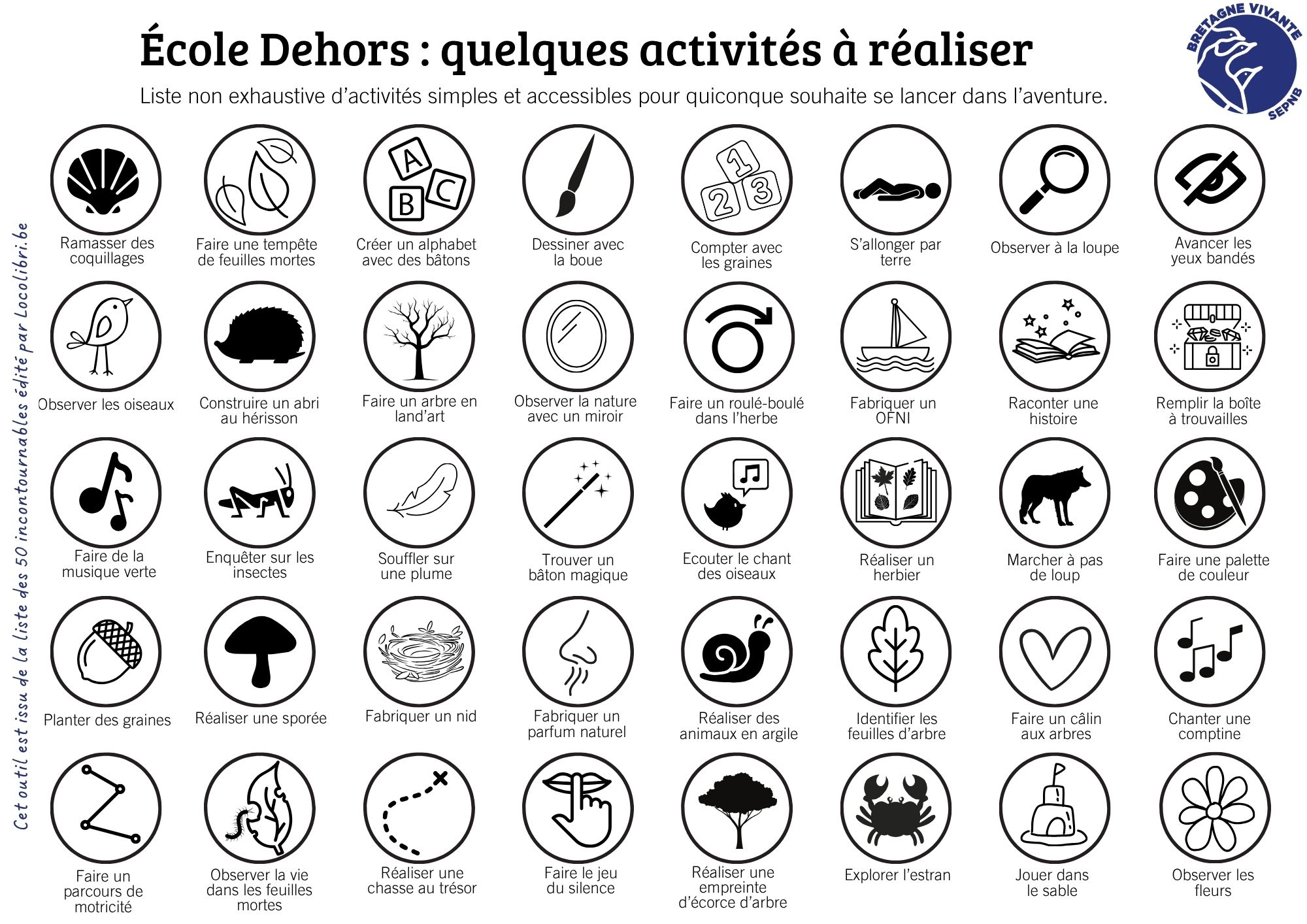 Cette activité peut se réaliser en plusieurs étapes, à l’occasion de diverses sorties, où les lettres sont comblées progressivement. Selon le temps disponible et l’engouement généré, libre à vous d’organiser et d’agencer cette activité, de lui trouver des prolongements selon les objectifs recherchés…